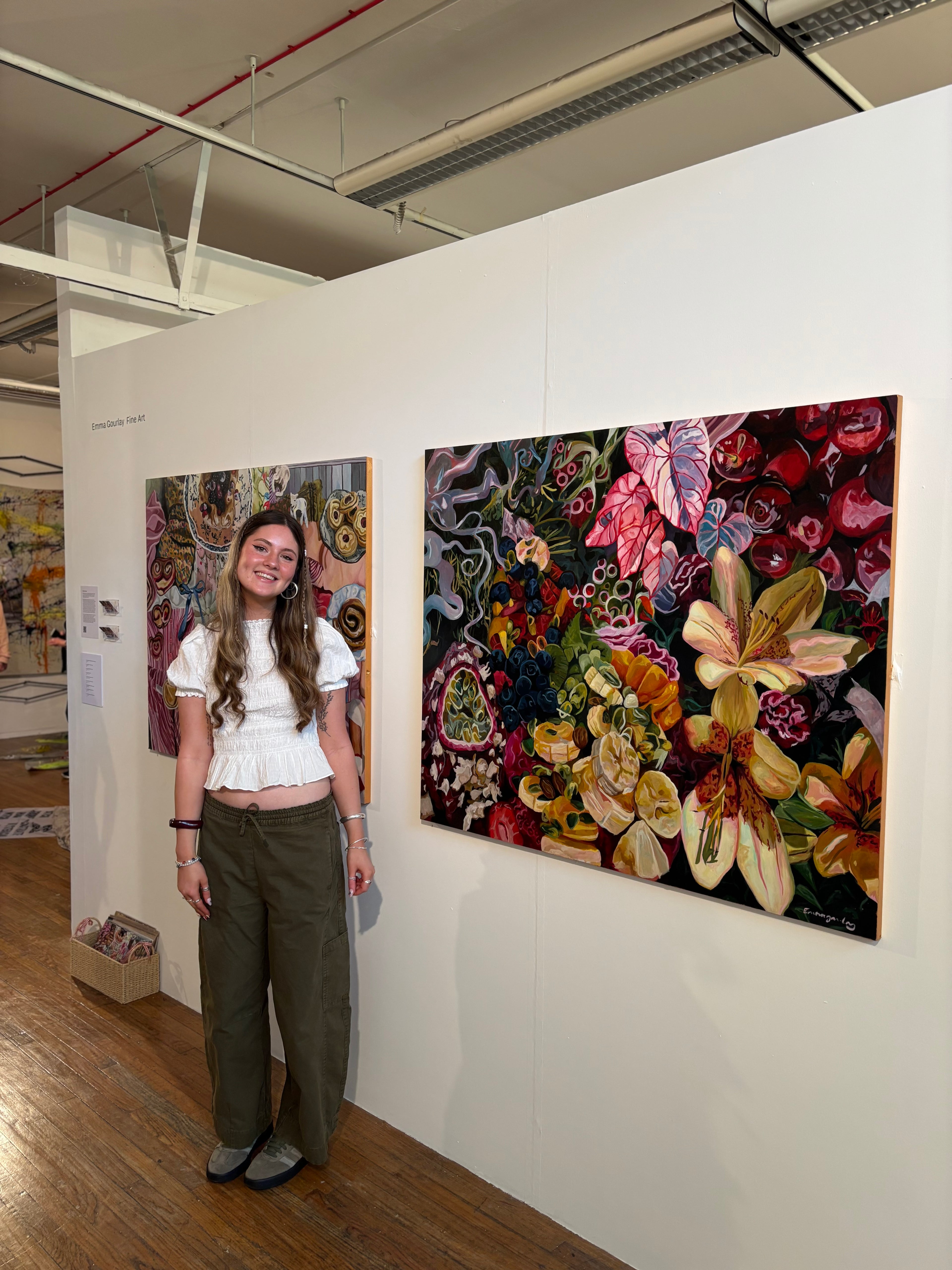 Emma believes we remember childhood memories like puzzle pieces that slot together in the wrong order, making us remember days in a unique light. She paints from the perspective of her childhood self, depicting objects and places as how she remembers seeing them as a young girl. Her work is a representation of girls a like, pulling elements from pop culture and literature to inform her practice, as well as being influenced by artists like Anthony Cudahy and Petra Schott. She wants her paintings to radiate positivity and create a bond between the viewer and the painting through the idea that girlhood is a collective experience.